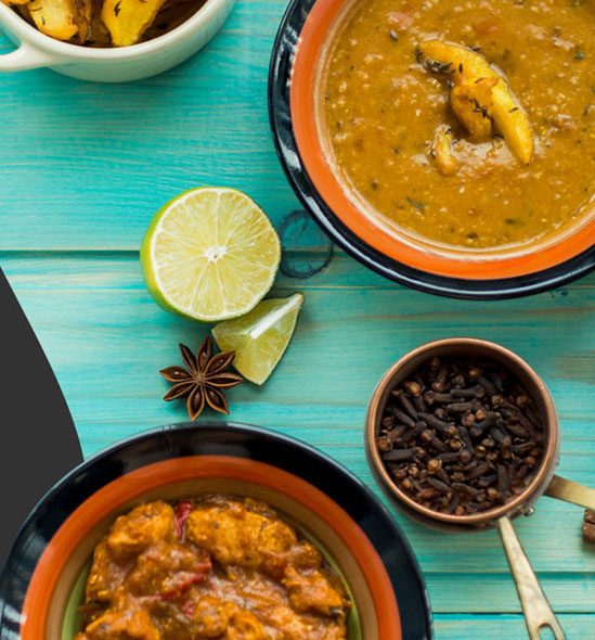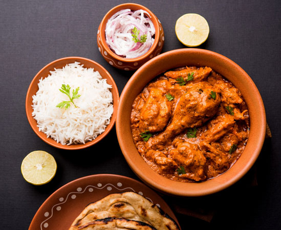 Alle kerrie gerechten worden geserveerd met rijst of Naan