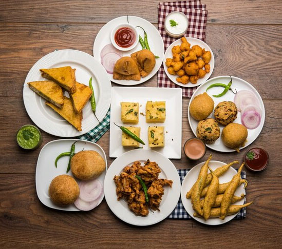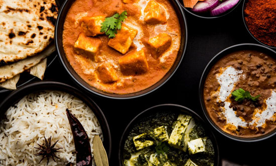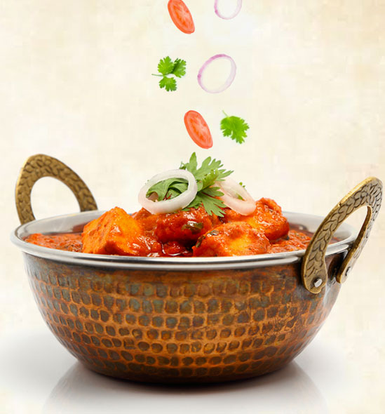 Bijgerechten zijn kleinere porties. Hoofdgerechten zijn grotere porties en worden geserveerd met rijst of naan.